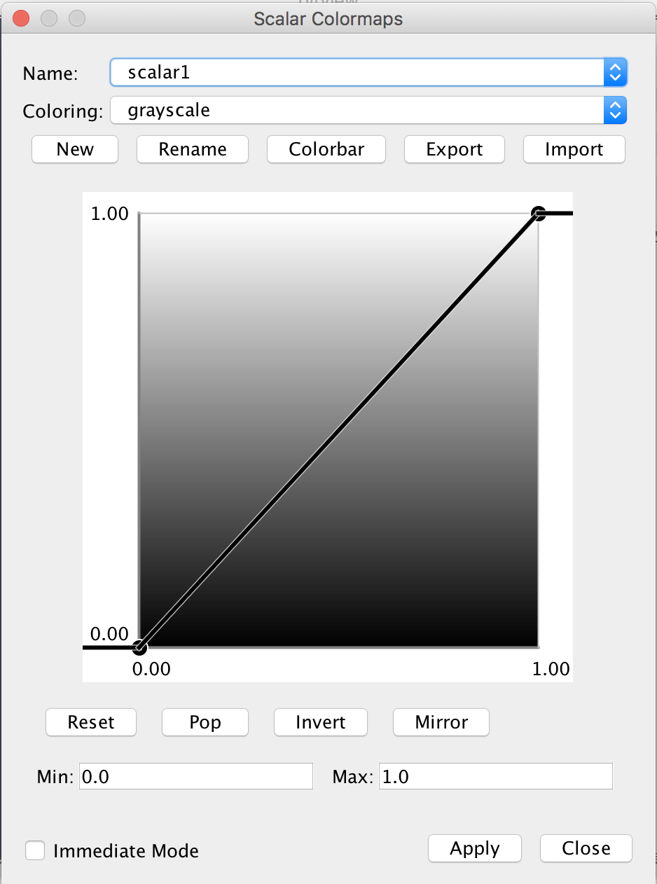 Each scalar colormap has an input range, consisting of a minimum and maximum value. You can detect these values from your specific dataset by clicking the Auto Min/Max button or selecting the Detect Intensity Range option in the Data menu.