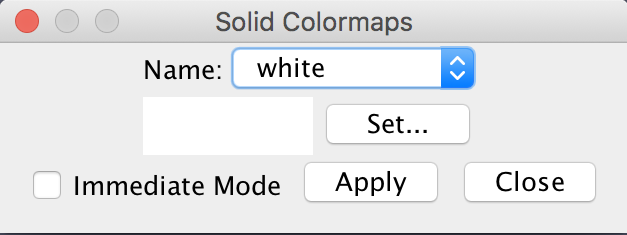 If you open the Settings>Solid Colormaps menu, you can edit the available solid colormaps (see image shown above). There are many provided by default, which you can modify as you like. The image above shows the Name combobox for choosing the colormap to edit. Once you have selected your desired colormap, you can change the associated color by selecting the Set… button. The changes are not automatically applied to the data, so you should then select the Apply button to update the rendering.