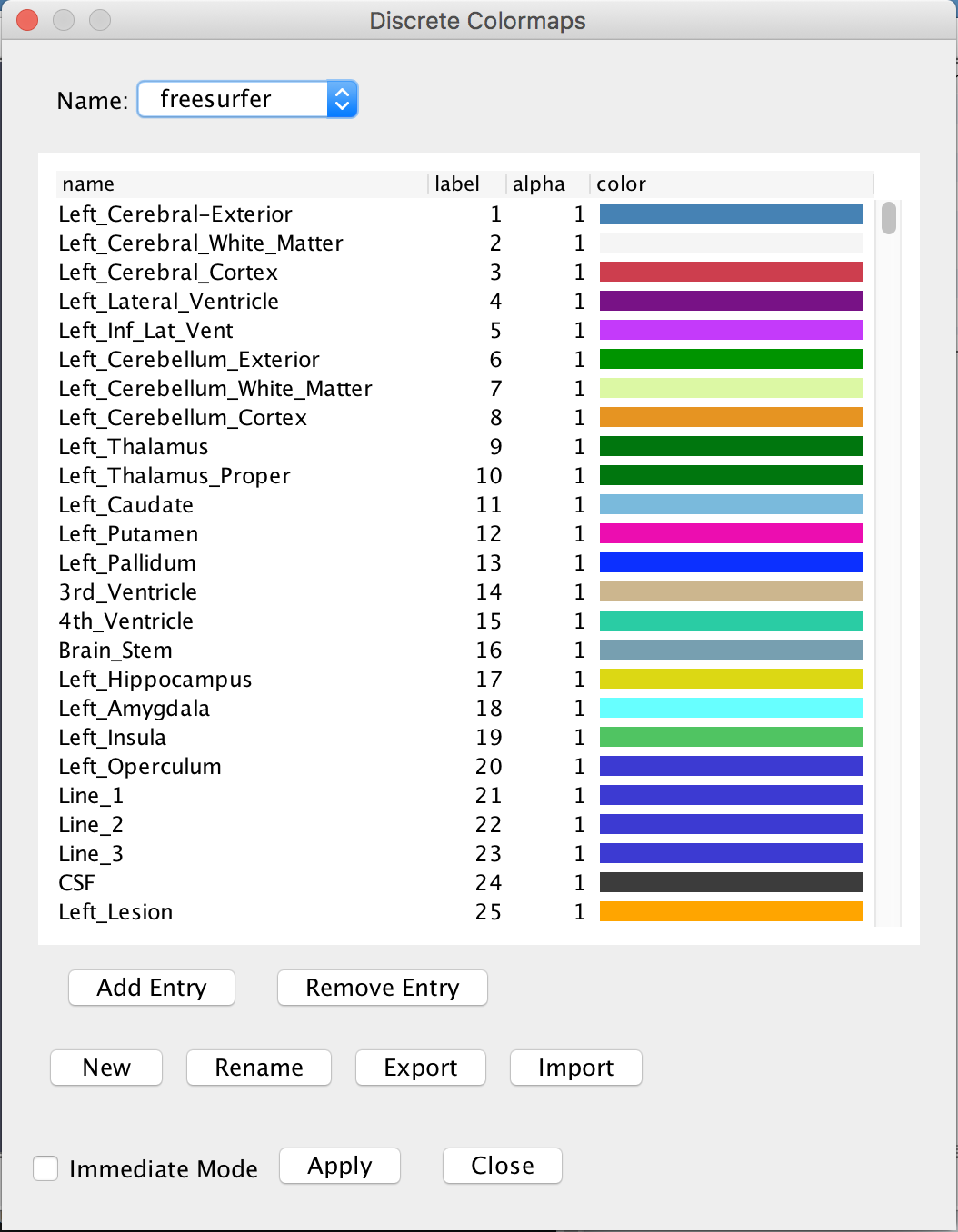 If you open the Settings>Discrete Colormaps menu, you can edit the available discrete colormaps. There are many provided by default, which you can modify as you like. The menu above shows the Name combobox for choosing the colormap to edit. Once you have selected your desired colormap, can see that there is a collection of names, labels, alpha values, and colors. You can edit these values by clicking on them. If you craft a colormap by hand, you may also want to save it to a file using the Export button. You can then load it back in next time you use qitview with the Import button. The changes are not automatically applied to the data, so you should then select the Apply button to update the rendering.