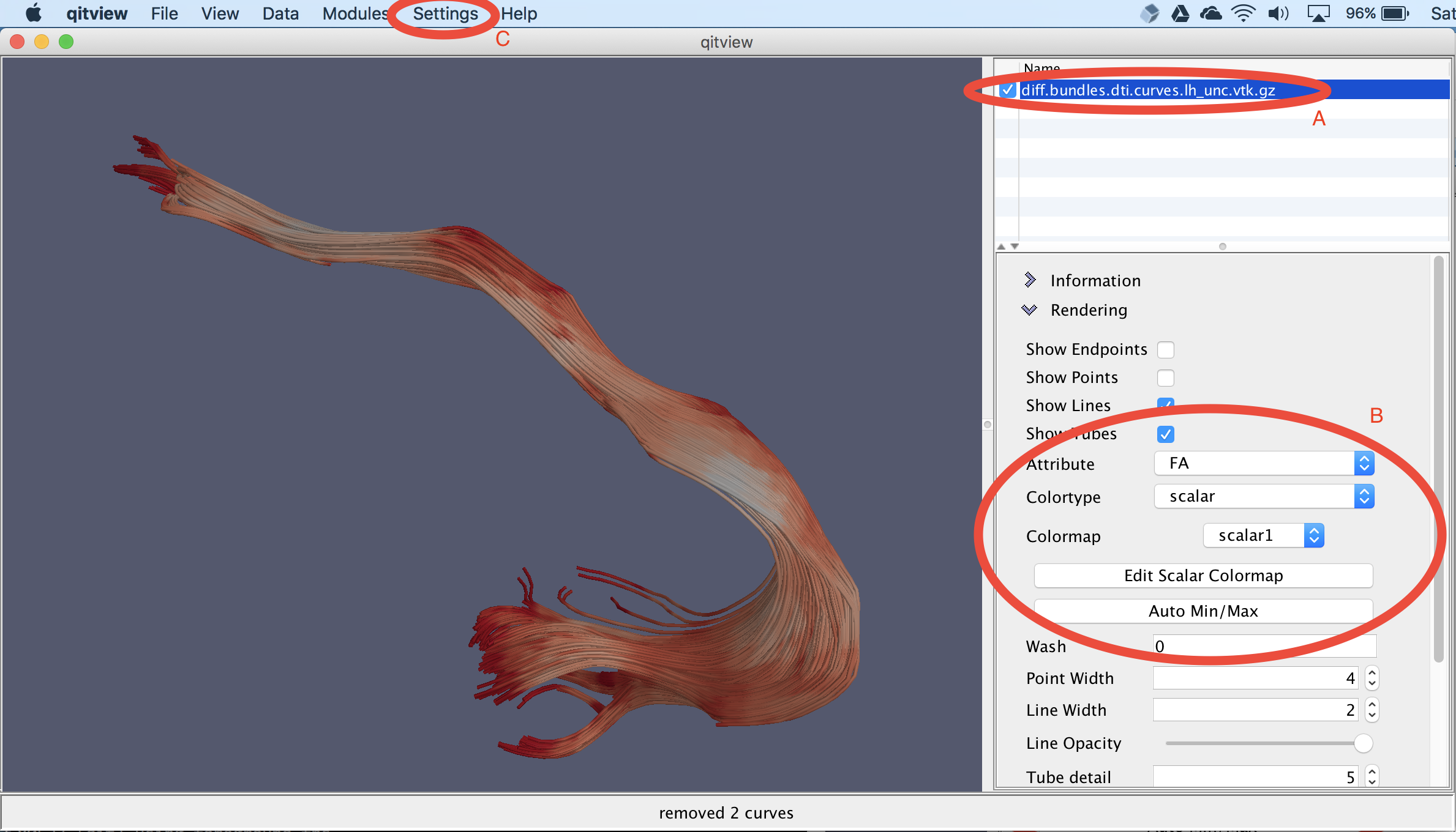 You can use QIT colormaps to visualize many different types of data, but the user interface is meant to be the same whether you are coloring a volume, mesh, or curves object. The image above shows you you can specify the coloring of a curves object. First, you check and select the data in the data list (A), then you open a control panel to see the coloring options (B), and optionally edit the colormap in the Settings menu (C). In the control panel, the three most important options are: