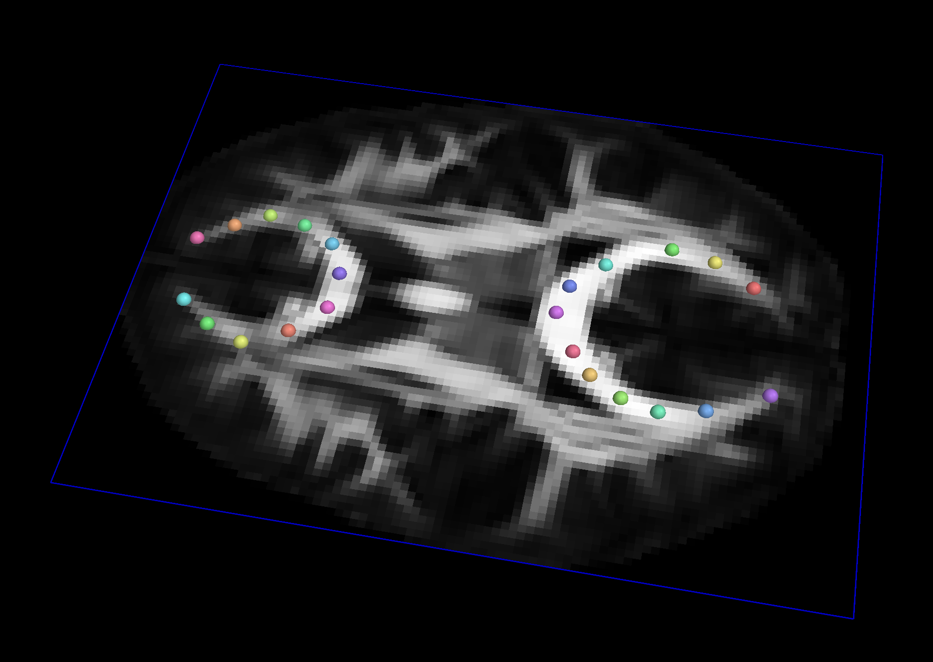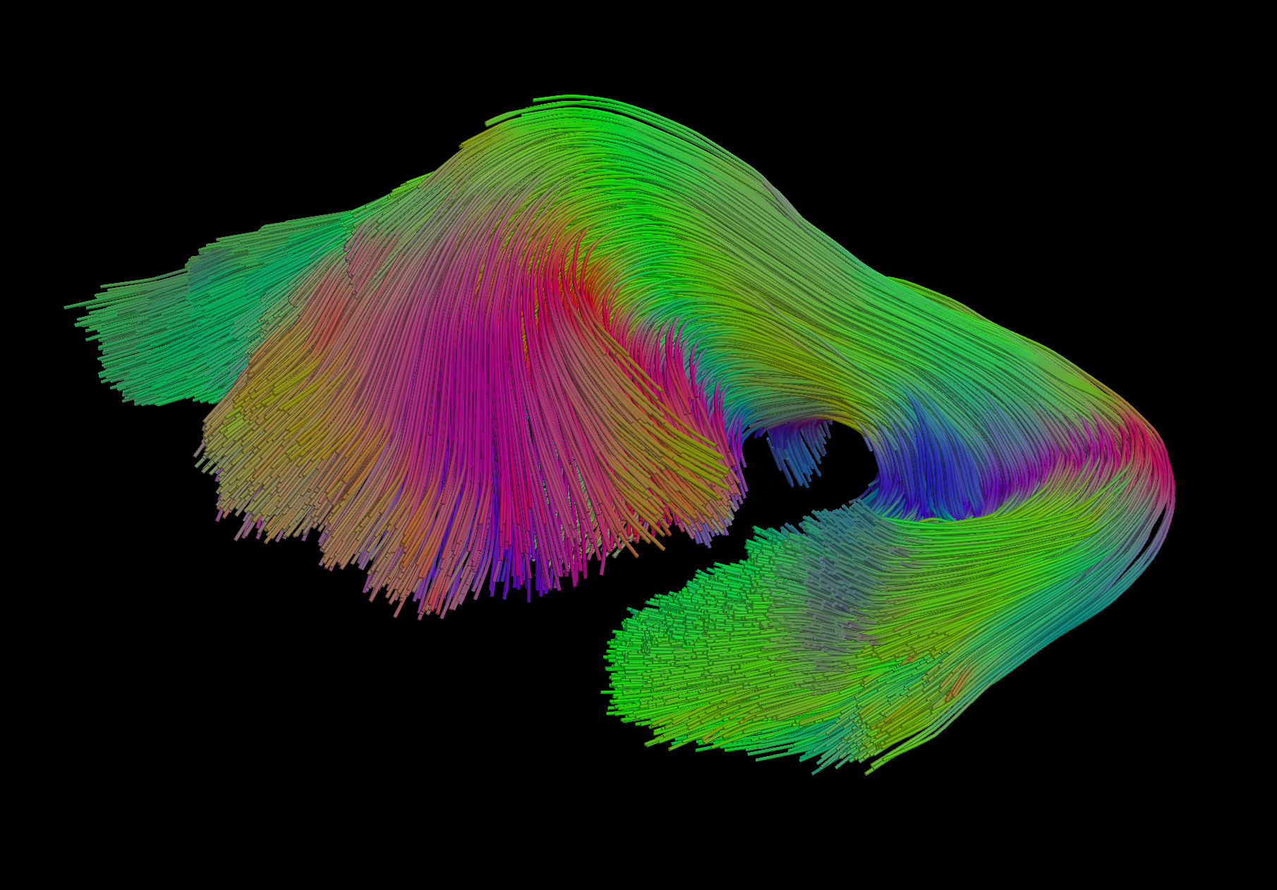 Curves is a dataset representing 3D space curves. A Curves object consists of many Curve objects, which are each a sequence of points and line segments connecting them (also known as a simple polygonal chain or poly-line). Each point along each curve also has named Vect attributes. The only required attribute is coord, which represents the 3D position of the point. There’s no constraint placed on the spacing between points, and the attributes can have any dimension. Typically, they are used to represent streamlines, iso-curves, or manually drawn landmark paths. In particular, tractography produces Curves from diffusion MR volumes and include a variety of diffusion-derived attributes.