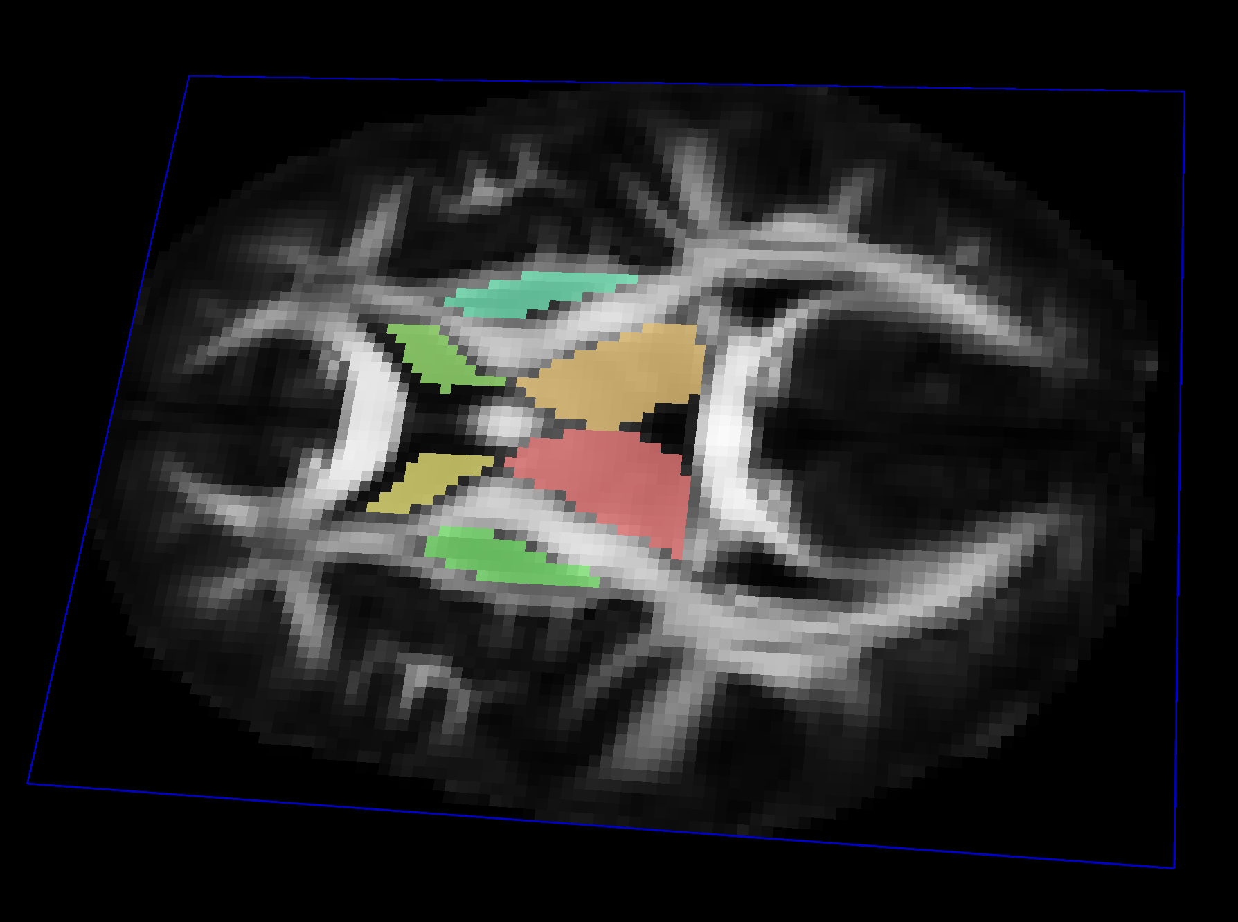 Mask is a dataset for storing volumetric labels. A Mask has a similar voxel grid structure to a Volume, except the value stored at each voxel is instead an Integer label. These labels are meant to discriminate between foreground and background voxels, and well as to indicate multiple labels for region-of-interest analysis. Mask and Volume datasets can look similar when saved to disk, but they get treated very differently in QIT. For example, when rendering an image slice, a Mask will use a discrete colormap with different values for each label, while a Volume will use a scalar colormap with continuously changing values assigned to pixel intensities. Furthermore, QIT allows you to manually draw on masks, and some modules require data to be loaded as a Mask. However, it you accidentally load a Mask as a Volume, there are menu items for converting between the two.