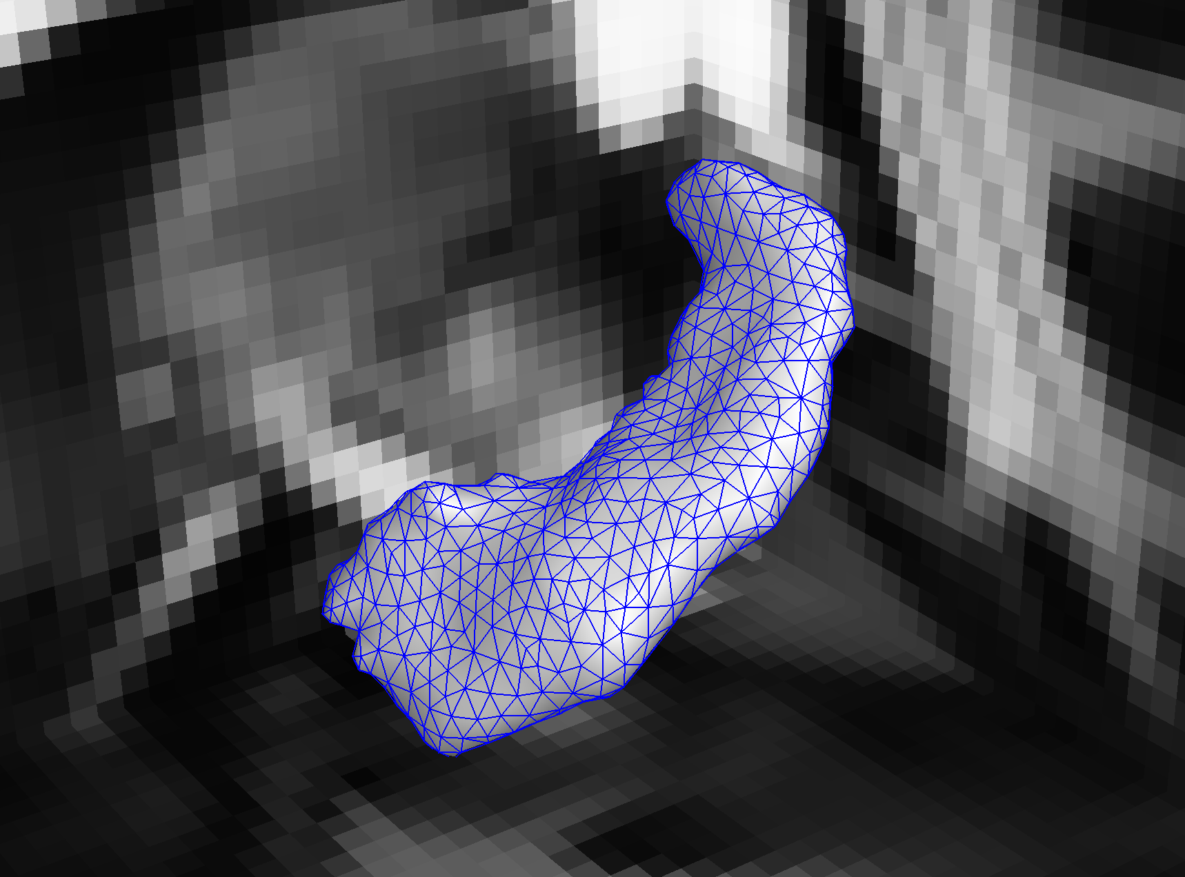 Mesh is a dataset representing a 3D triangulated surface. Each Mesh consists of a collection of Vertex objects, representing the vertices of the triangles, and a collection of Face objects representing the triangles themselves. The 3D position (and any other desired attribute) of the vertex is stored as named Vect objects associated with each Vertex. The only required attribute is coord, which represents the 3D position of the Vertex; otherwise, attributes may have any name and Vect dimension. The triangles are expected to form a manifold surface mesh, meaning they are locally flat and that each edge is shared by at most two faces. The order of Vertex objects in each face reflects the orientation, and the edges of coincident faces should have opposite directions. A mesh may have many disconnected components or even form a “triangle soup” of unconnected Face objects. They are commonly used to represent boundaries between structures, level sets, and glyphs. They are especially useful for illustrating 3D structures that are difficult to visualize from volumetric slices.
