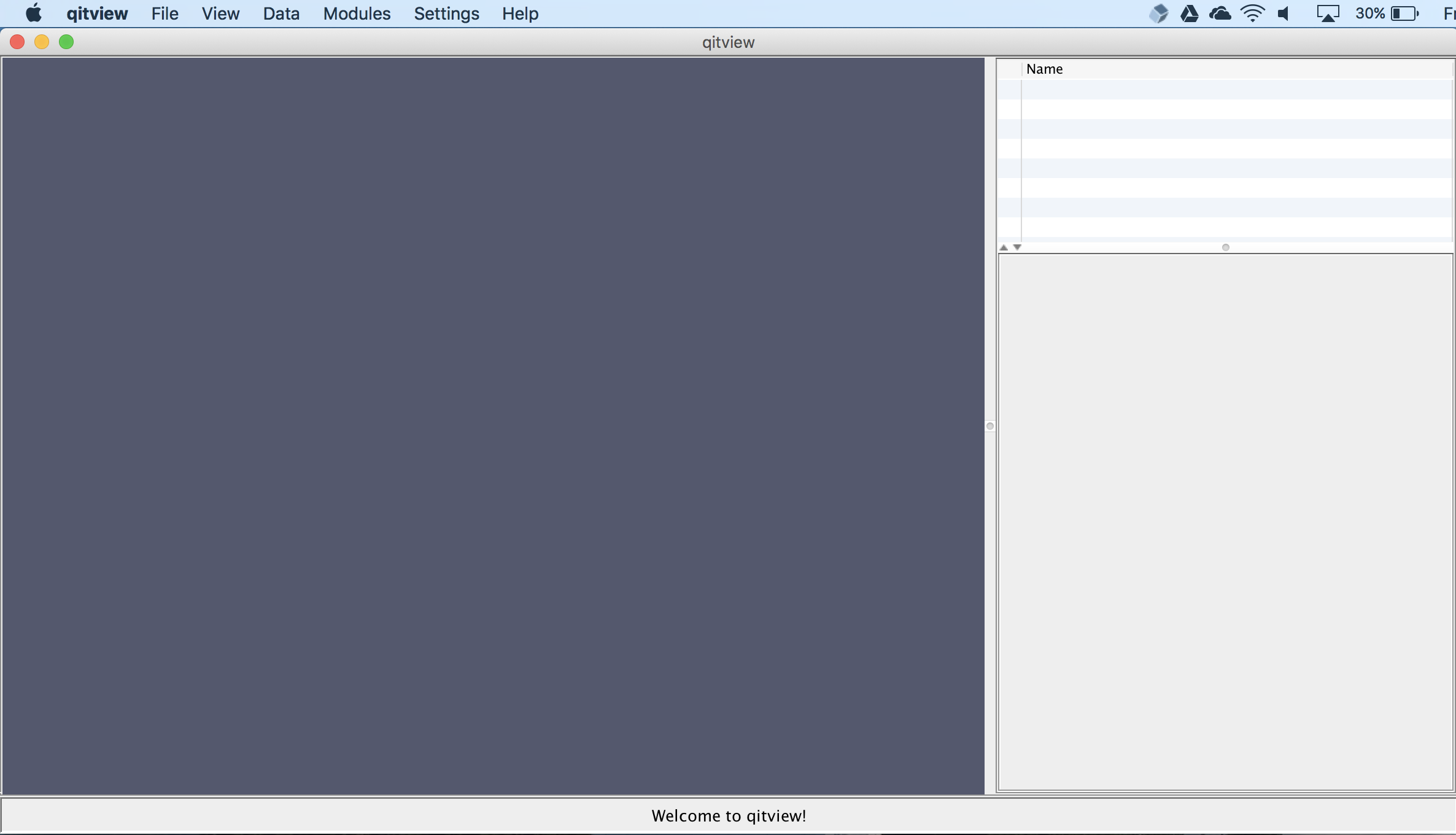 First, we’ll start qitview. You can do this by running qitview or qitview.pyby either double clicking in your file explorer or executing them on the command line . Once you’ve started the program, you should see console messages about the progress and a window that looks like the image below. There are three sections to the viewer: