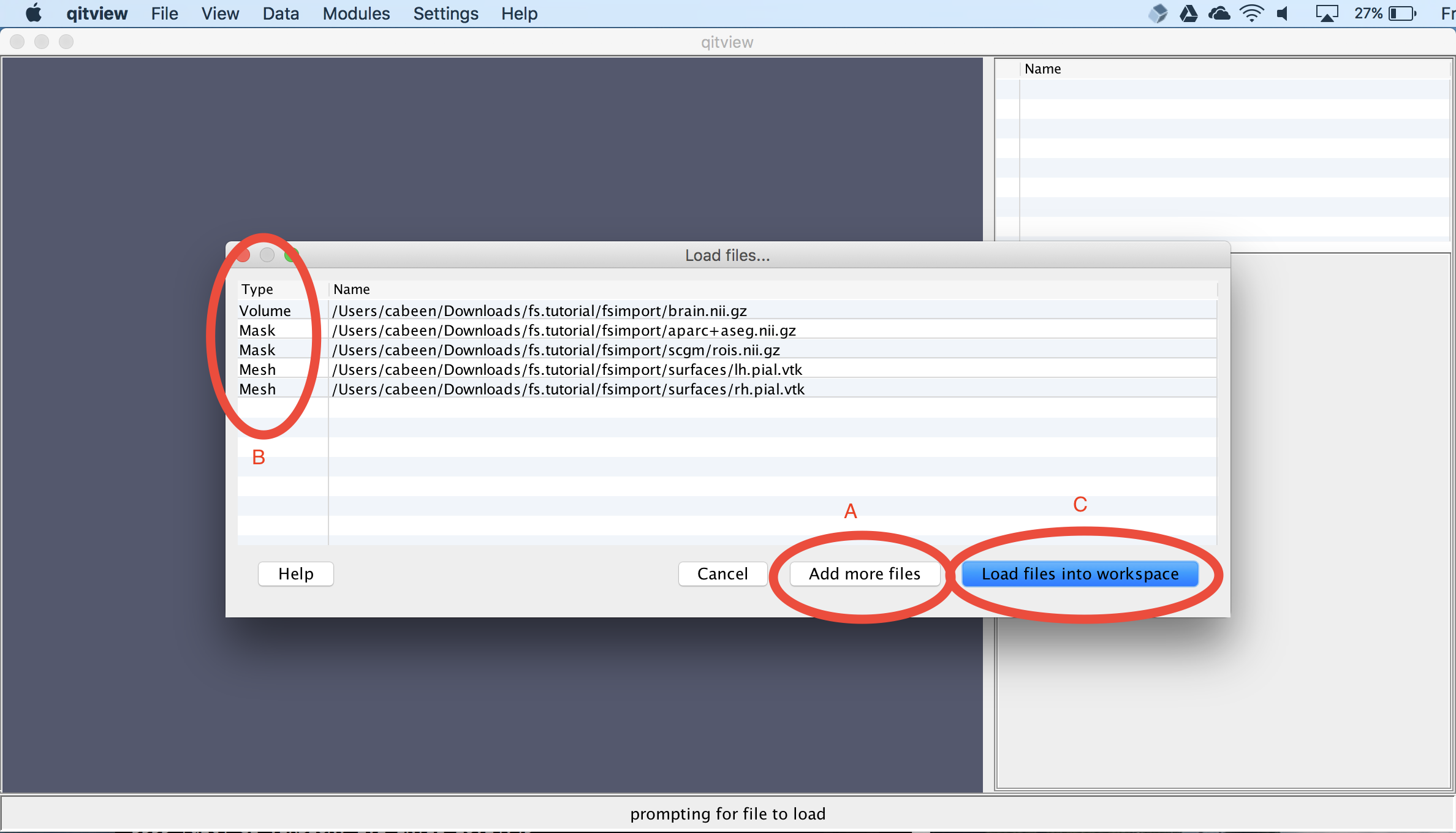 After that, you need to set the file types to the types listed above (B). Then, you can load the files by clicking Load files into workspace (C):