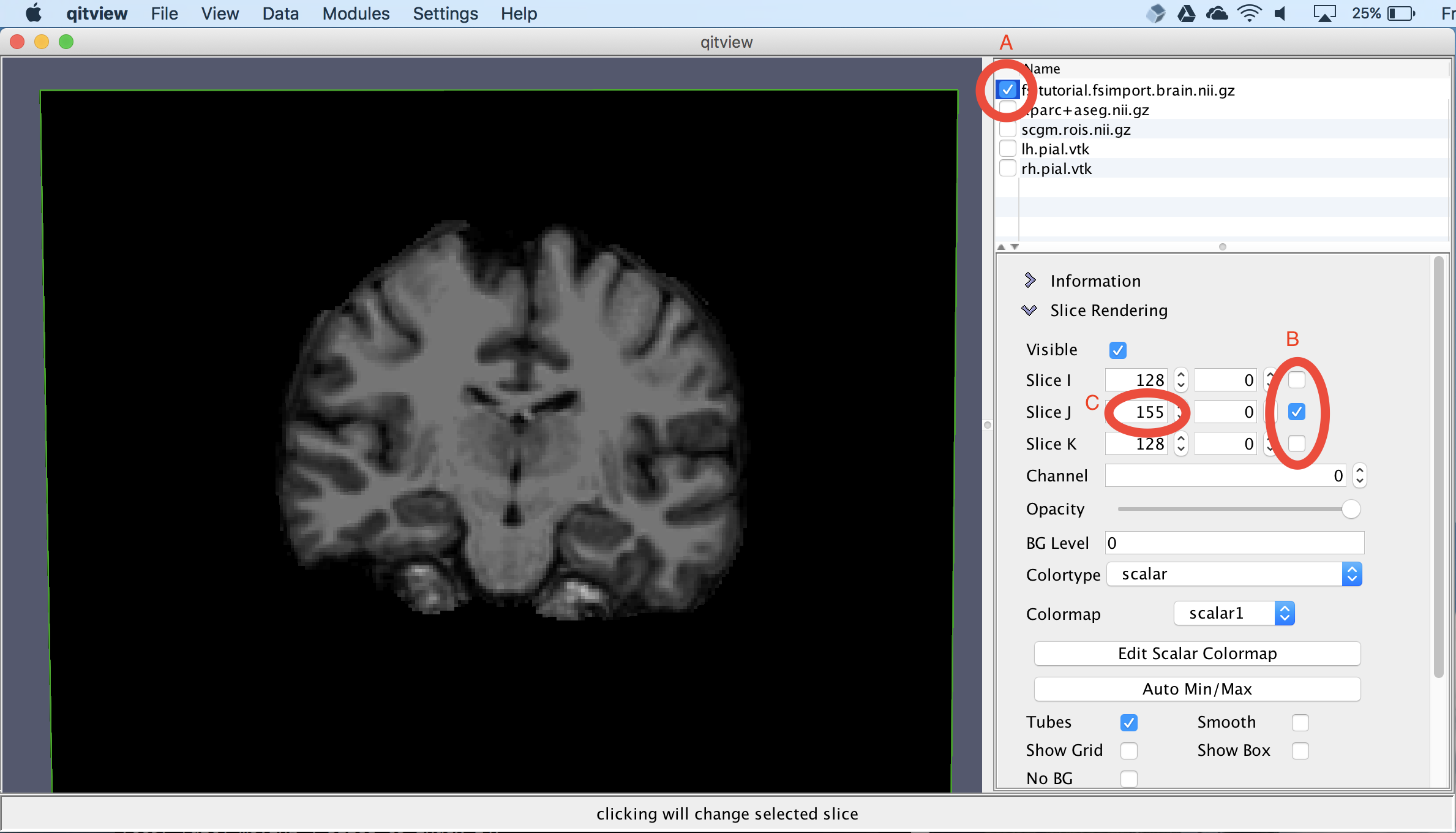 Next, we will visualize the input T1-weighted MRI dataset. First, click the box next to brain.nii.gz (A). Next, we will isolate a coronal slice by first unchecking the Slice I and Slice K checkboxes (B) and then changing the Slice J index to 155 (C):