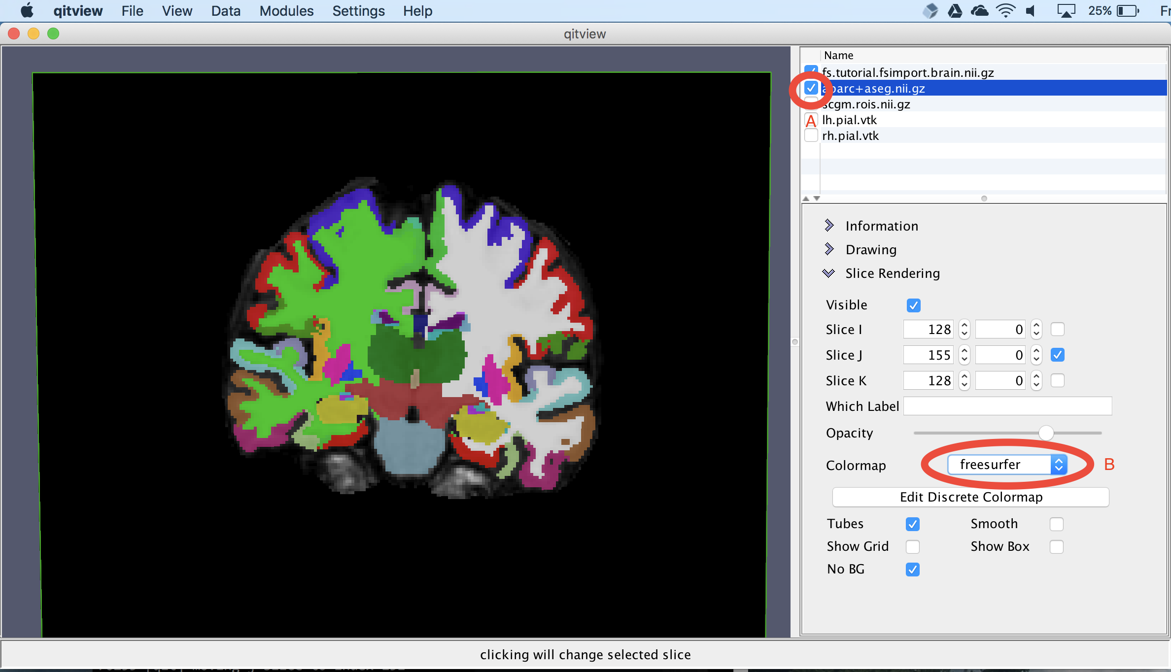 Next, we’ll visualize the volumetric segmentation. First, you should select aparc+aseg.nii.gz and click the box next to it. Next, you should change the colormap to freesurfer. Now you should see an overlay segmentation on the T1 image: