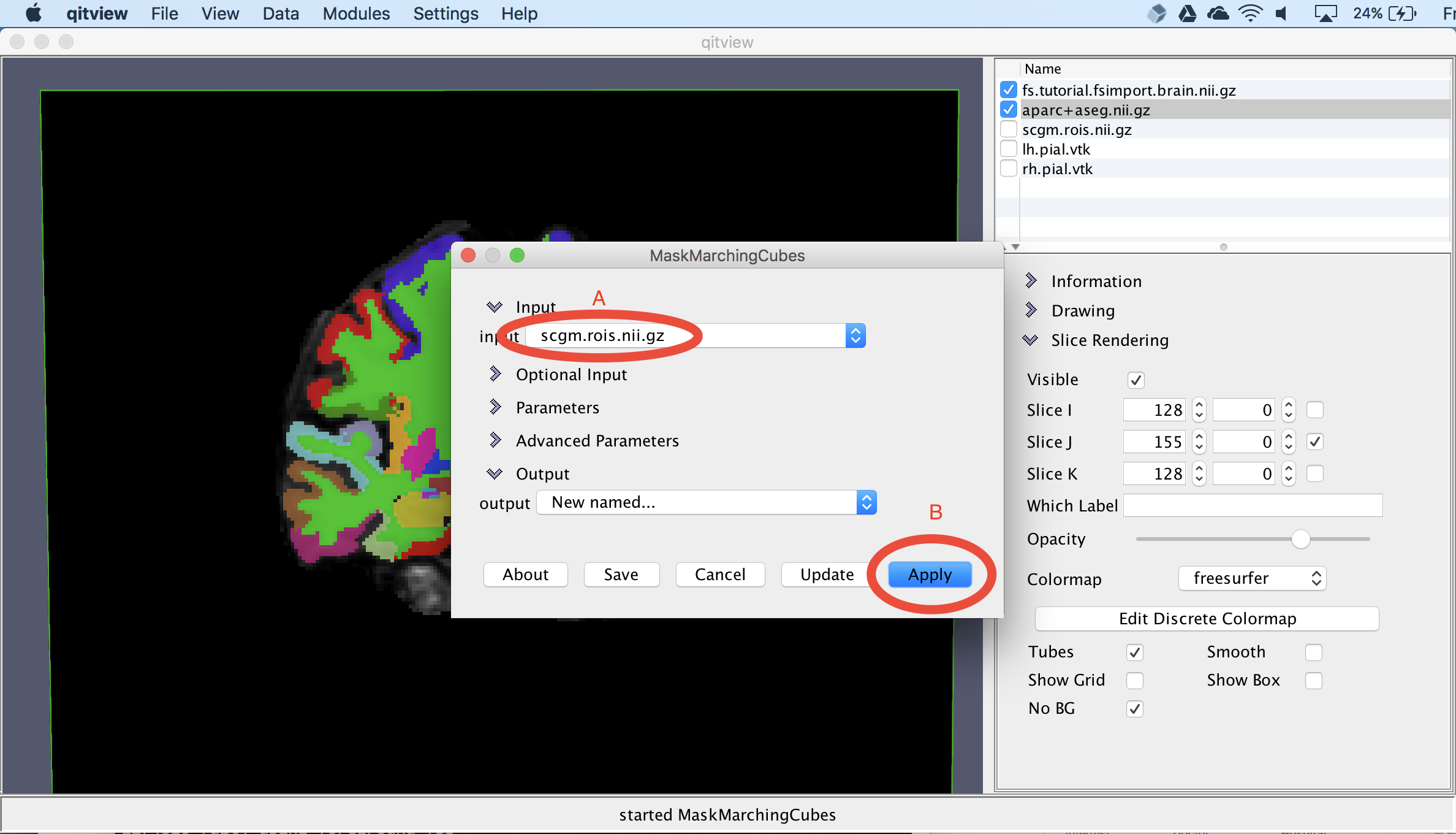 Next, we’ll visualize the subcortical structures. First, you should select scgm.rois.nii.gz and click the box next to it. Then, you should open the module MaskMarchingCubes. You should set the input to scgm.rois.nii.gz (A) and select the Apply button (B). The module will then ask you for a name for the new mesh object, which you can call scgm:
