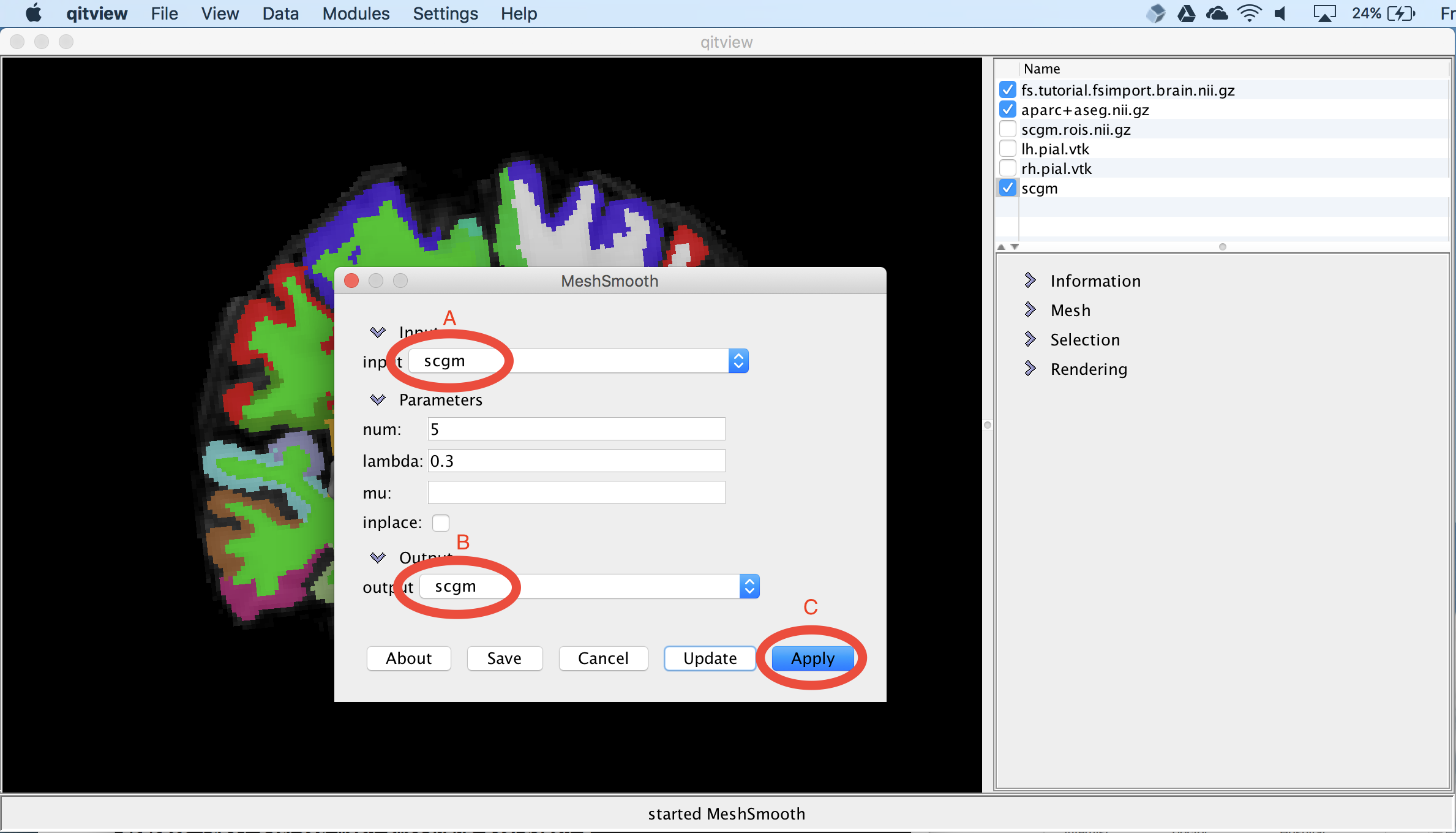 The surface models created by the previous step are jagged due to aliasing, so next, we’ll smooth surface to reduce the discretization effects. First, you should open the model MeshSmooth. You should ensure the input is scgm (A) and then set the output to scgm. This will replace the original scgm with the new smoothed version. Then select the Apply button to run the module (C):