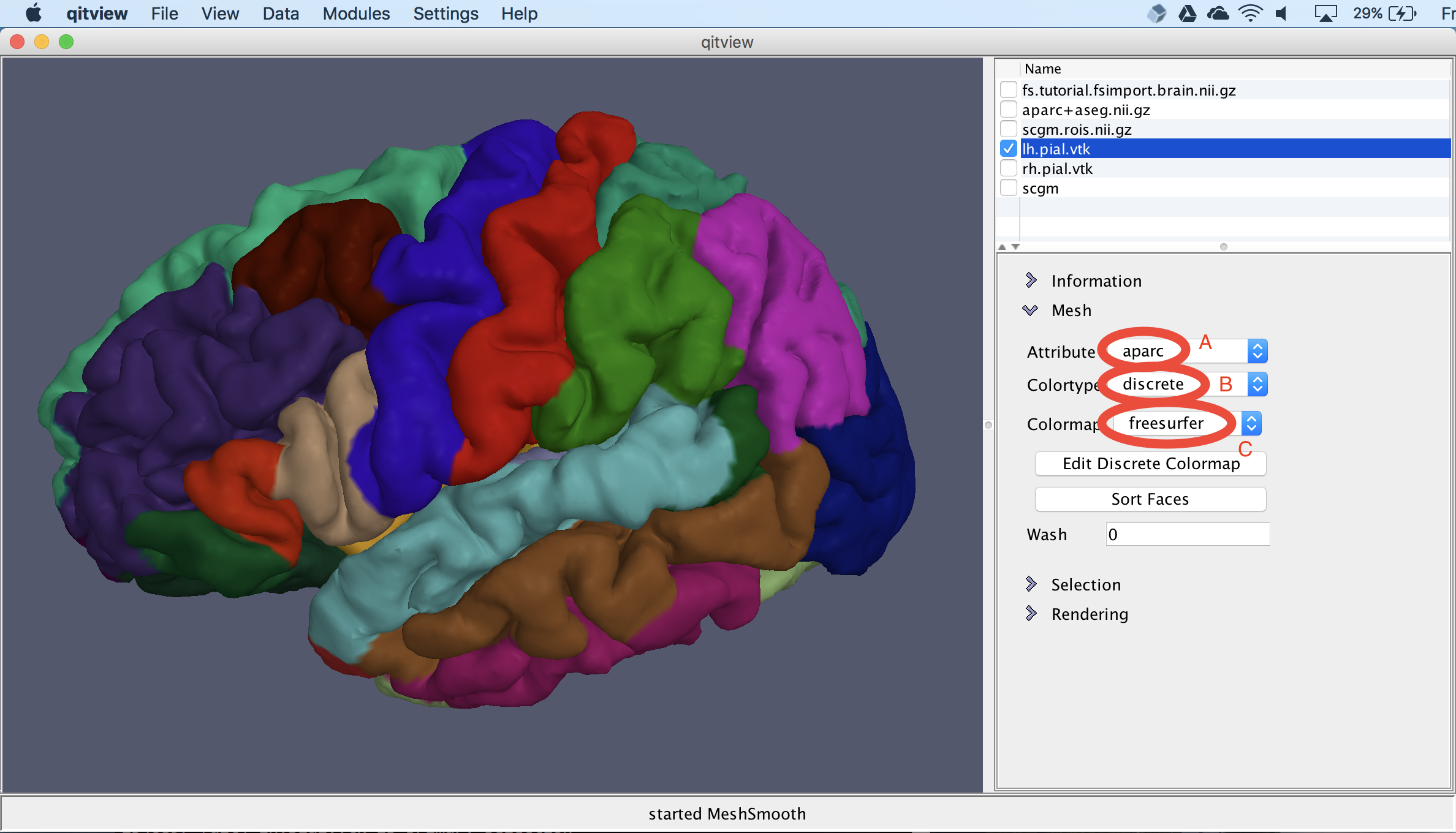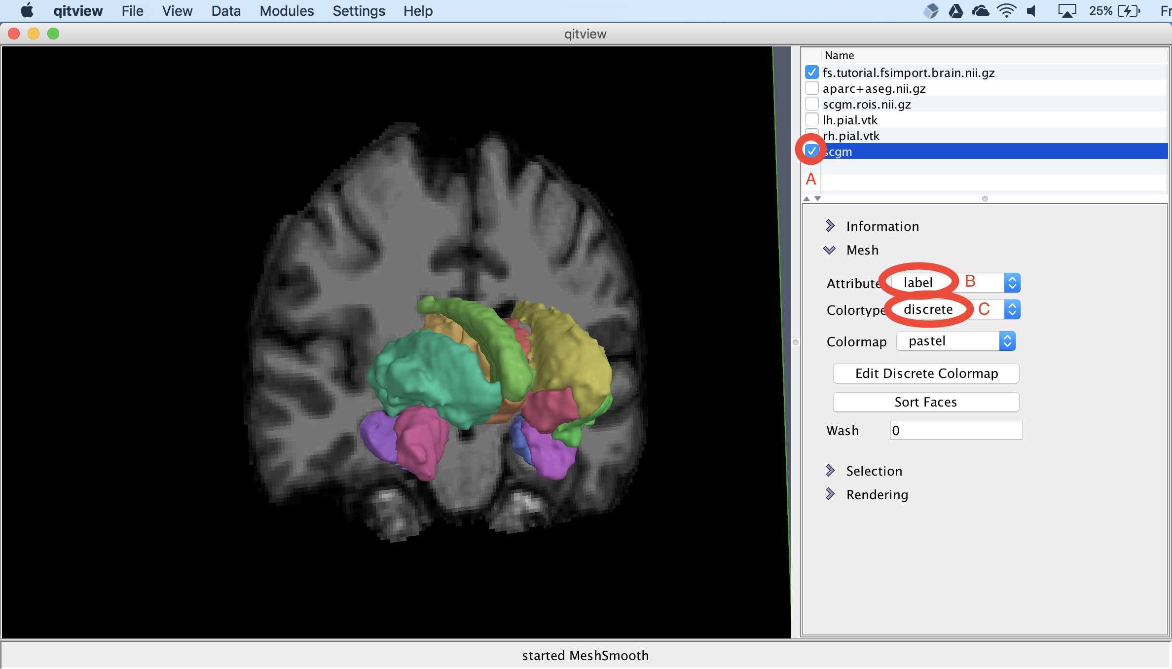 Next, we will visualize the surface models of the subcortical structures. First, you should select the scgm object and select the box next to the name (A). This needs some color to distinguish the different structures, so we can change the Attribute to label (B) and then change the Colormap to discrete (C). This should now show meshes with distinct colors for each structure: