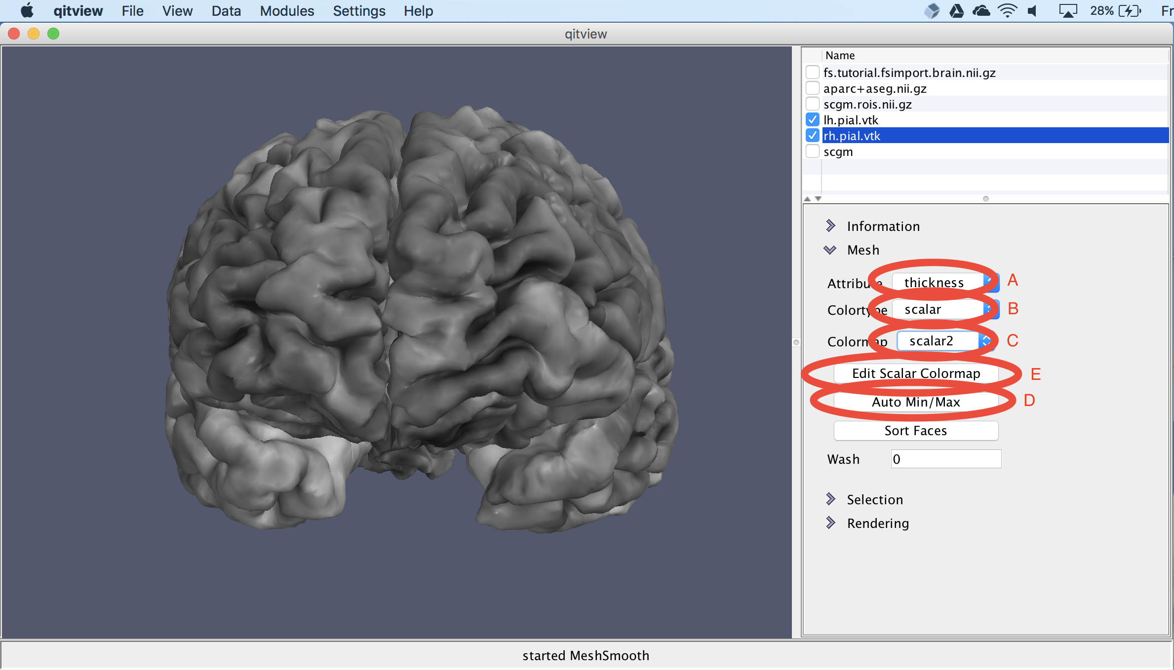 Next, we will visualize cortical thickness on the surface. First, you should change the Attribute to thickness (A), then change the Colortype to scalar (B), and then change the Colormap to scalar2 . We need to change the scalar colormap because the T1 MRI is being visualized using scalar1. Next, you should select the Auto Min/Max button to adjust the colormap range to match the cortical thickness values. Currently, it’s showing grayscale, so you should select the Edit Scalar Colormap to pick something else (E):