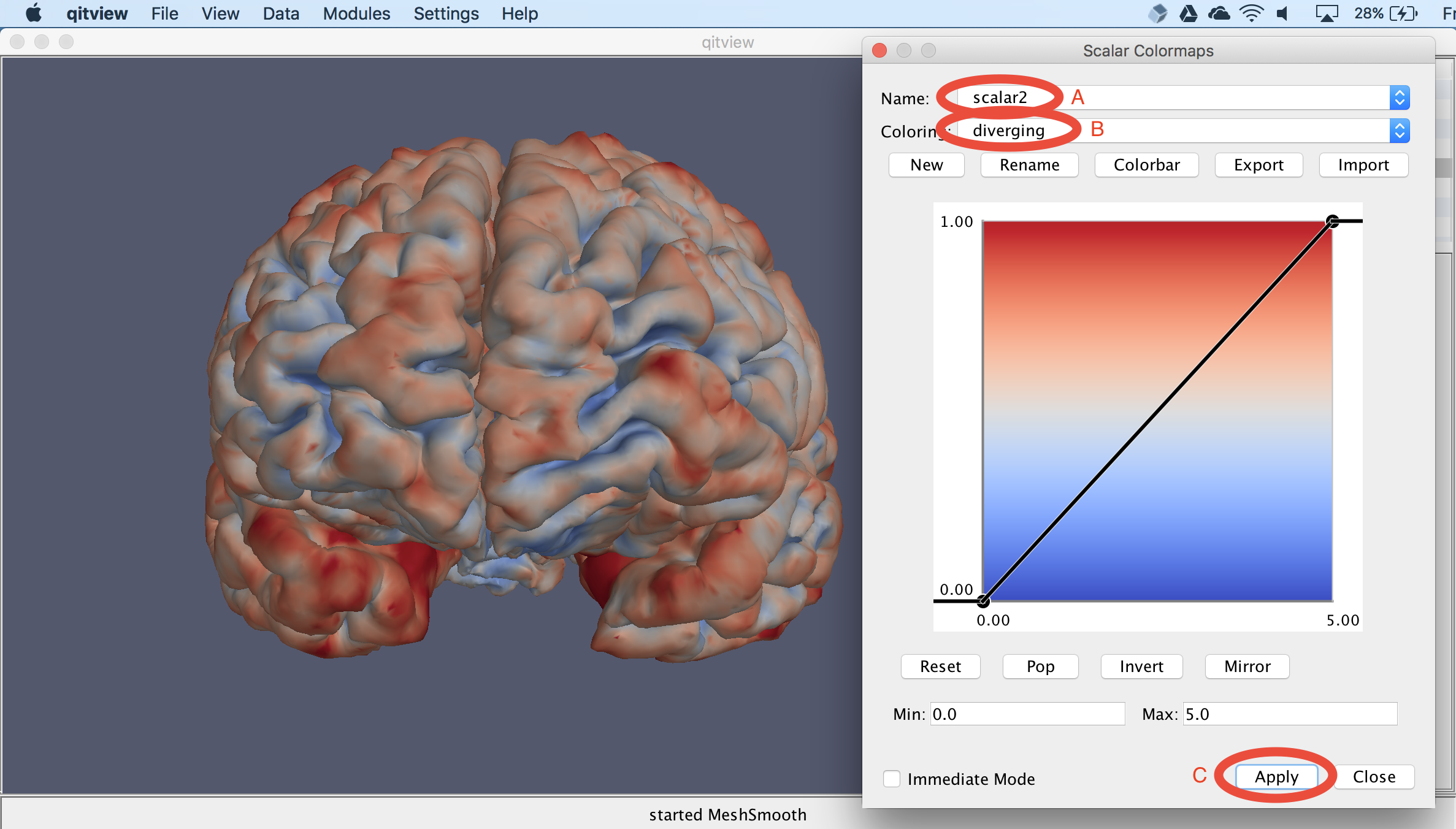 Now, you should see a colormap editor window. You should first change the Name to scalar2 (A) and then change the Colormap to diverging (B). You can also experiment with other colormaps besides that one. Then, to apply the colormap, you should select the Apply button (C):