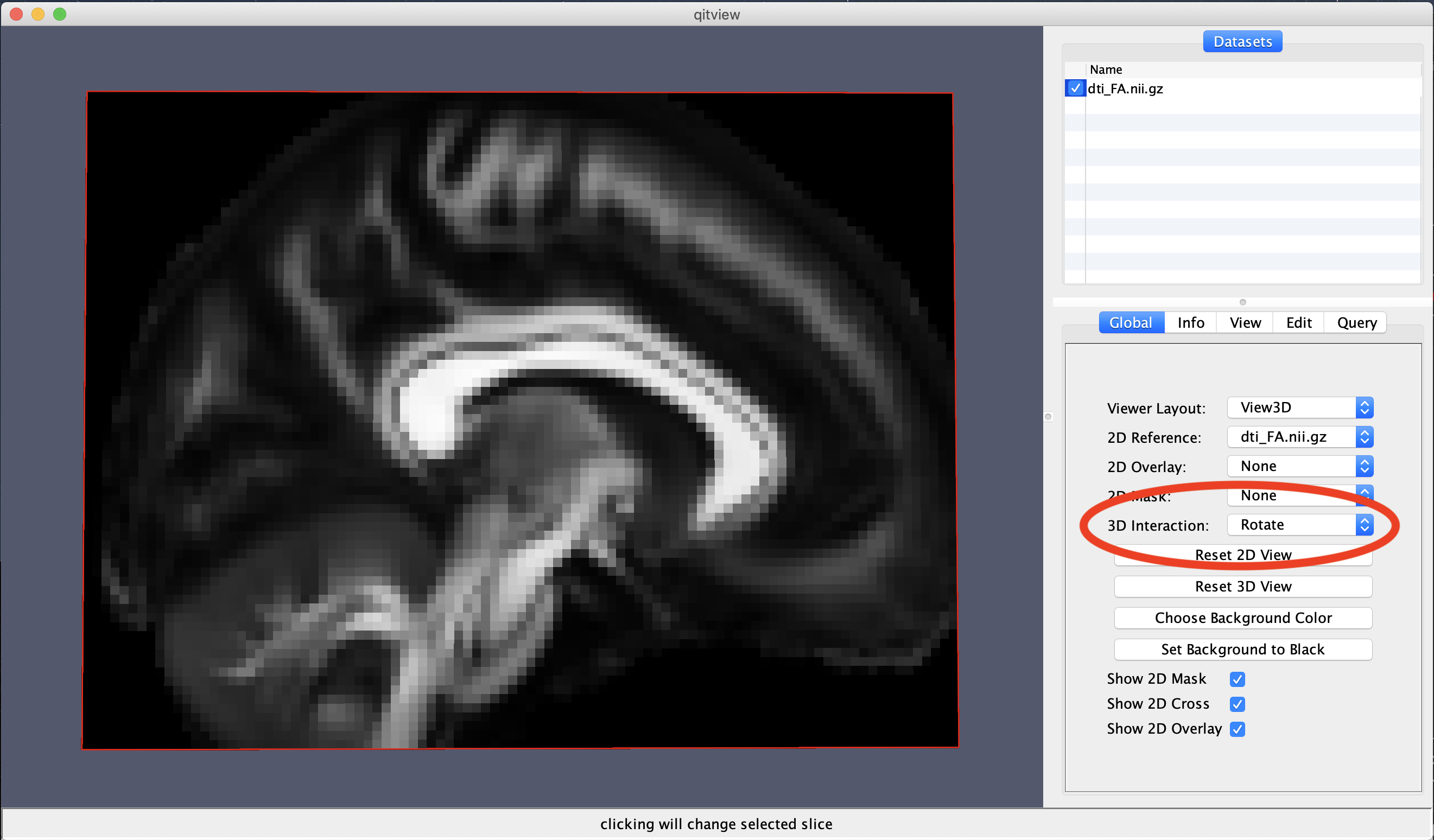 If for any reason you have difficulty using the mouse and keyboard at the same time, you can also specify the interaction mode using the mouse. You can find this 3D Interaction combo box in the Global tab of the Control Panel. This will include camera interactions, such as Rotate, Pan, and Zoom. You can quickly reset the interaction mode by pressing the Escape key. Note, the 3D Interaction menu will change based on the dataset you have highlighted for example, when a volume is highlighted, there is an interaction mode for changing the image slice.