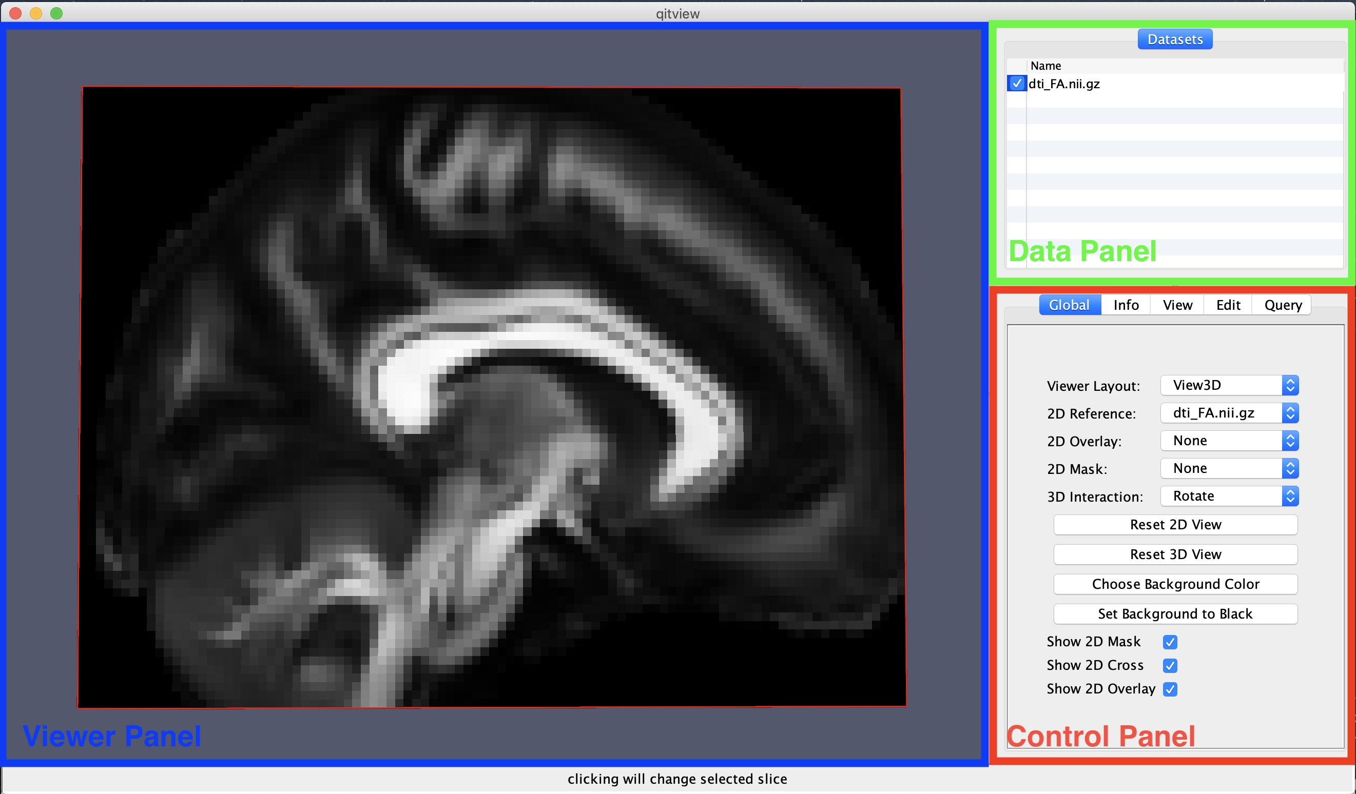 The Data Panel is important for choosing which Datasets you are controlling, specifically you have to select the item in the list so that it is ‘’highlighted’‘. Once highlighted, the Control Panel will be updated to show controls for that specific dataset under the Info, View, and Edit tabs. After highlighting a dataset, the Viewer Panel will also accept mouse interactions that are applied only to the selected dataset. For example, if you use a mouse action for drawing, it will only apply to the selected dataset. There are also a few ‘’global’’ mouse interactions in the Viewer Panel that are not applied to the highlighted datasets (for example rotation, panning, and zooming), and these are clearly indicated below.