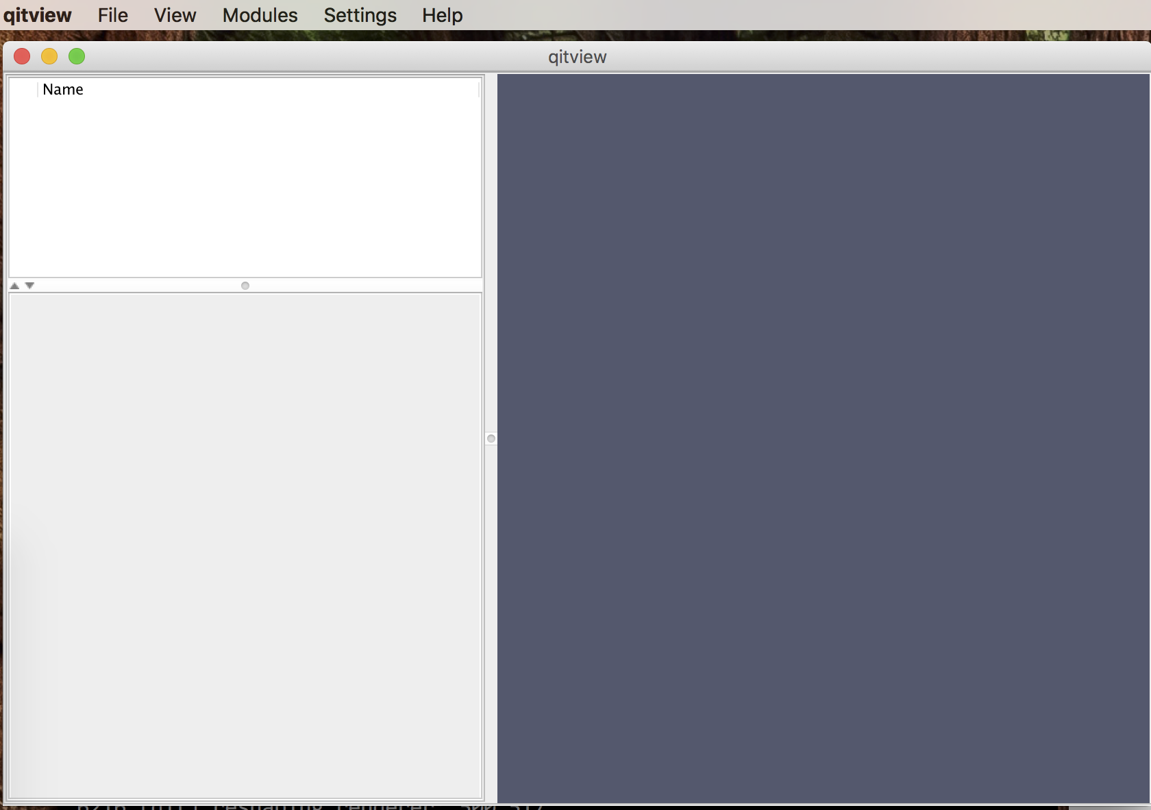 The viewer is a single 3D rendering application named qitview. If you followed the Installation, you should only have to type this command in your terminal. Then, the graphical interface will open and look like this:
