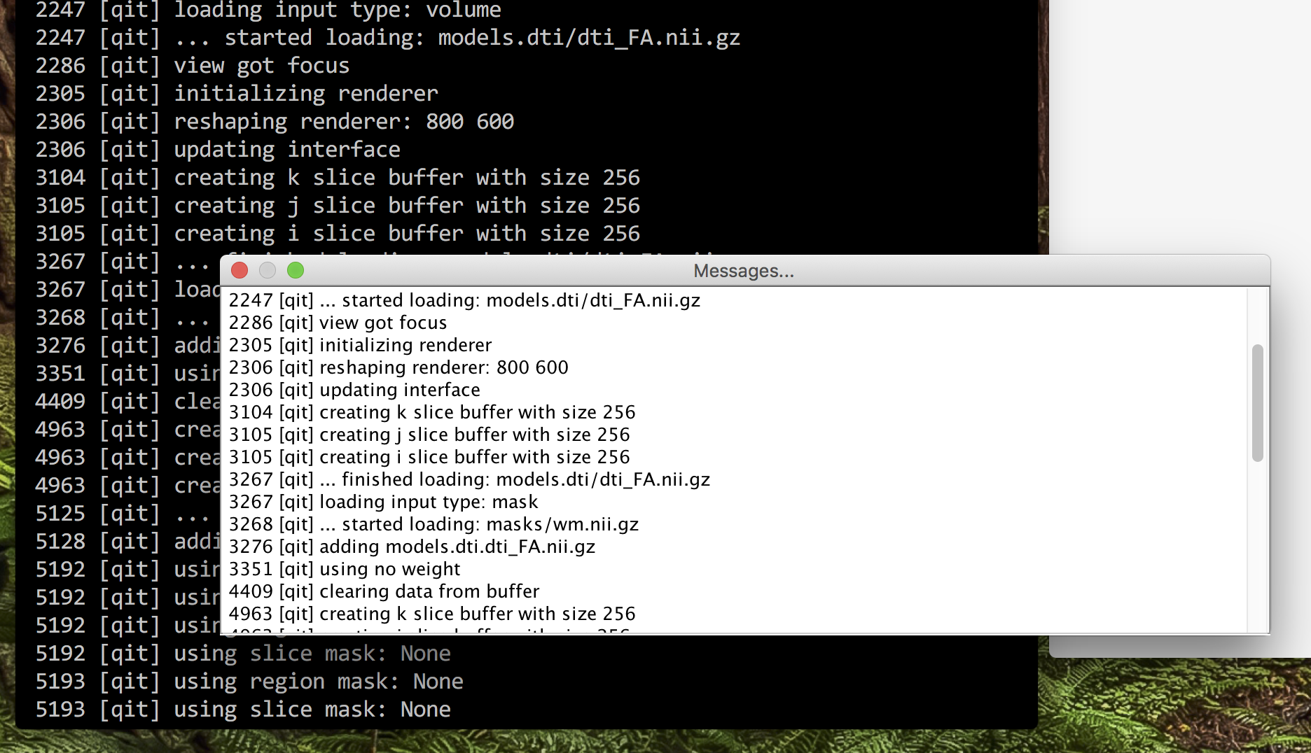 qitview produces a lot of messages, either about what you are currently doing or what is happening in the background. These are all printed to the command line, so it can be helpful to make the console visible. Alternatively, you can open a messages window by selecting Settings>Messages....
