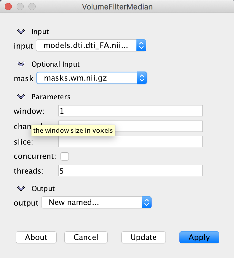 There are many modules available for processing data, and they are listed in Modules menu. The modules are organized by the primary data type they operate on; however, many modules combine datatypes. When you select a module, a window will open that will let you specify inputs, parameters, and outputs. For example, the VolumeFilterMedian module will look like this: